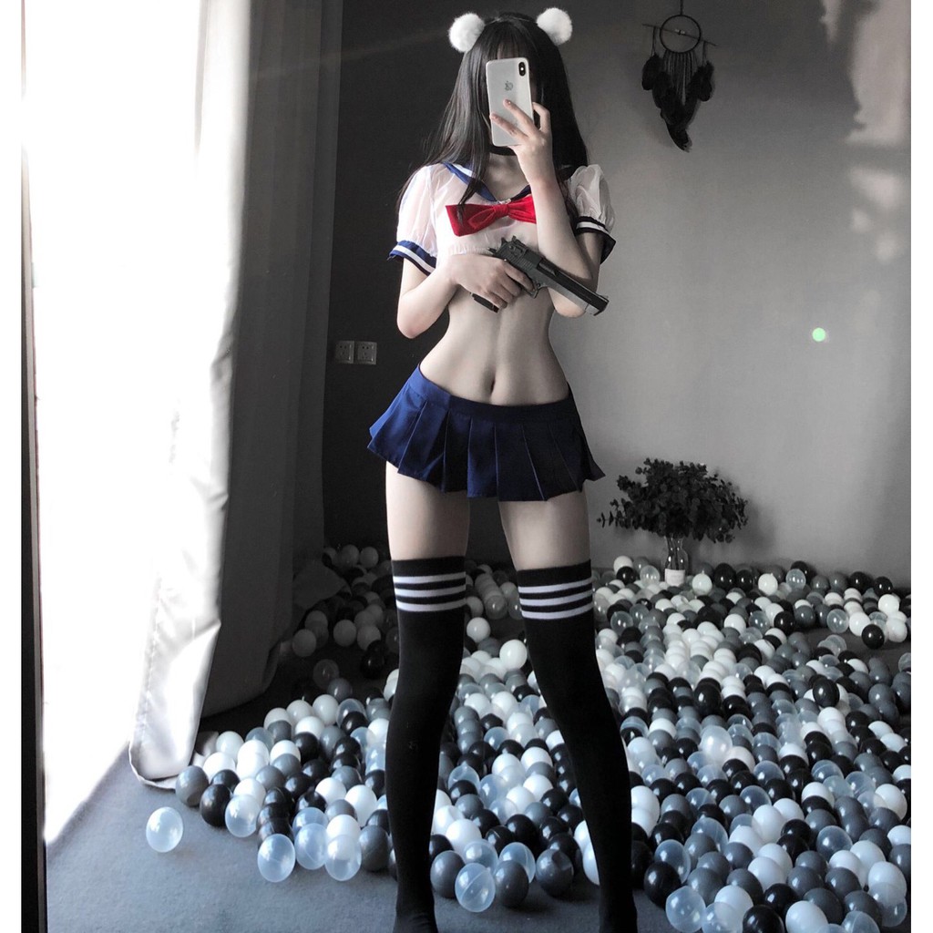 Giới thiệu Đồ ngủ sexy cosplay nữ sinh croptop xuyên thấu + quần chip G string 40