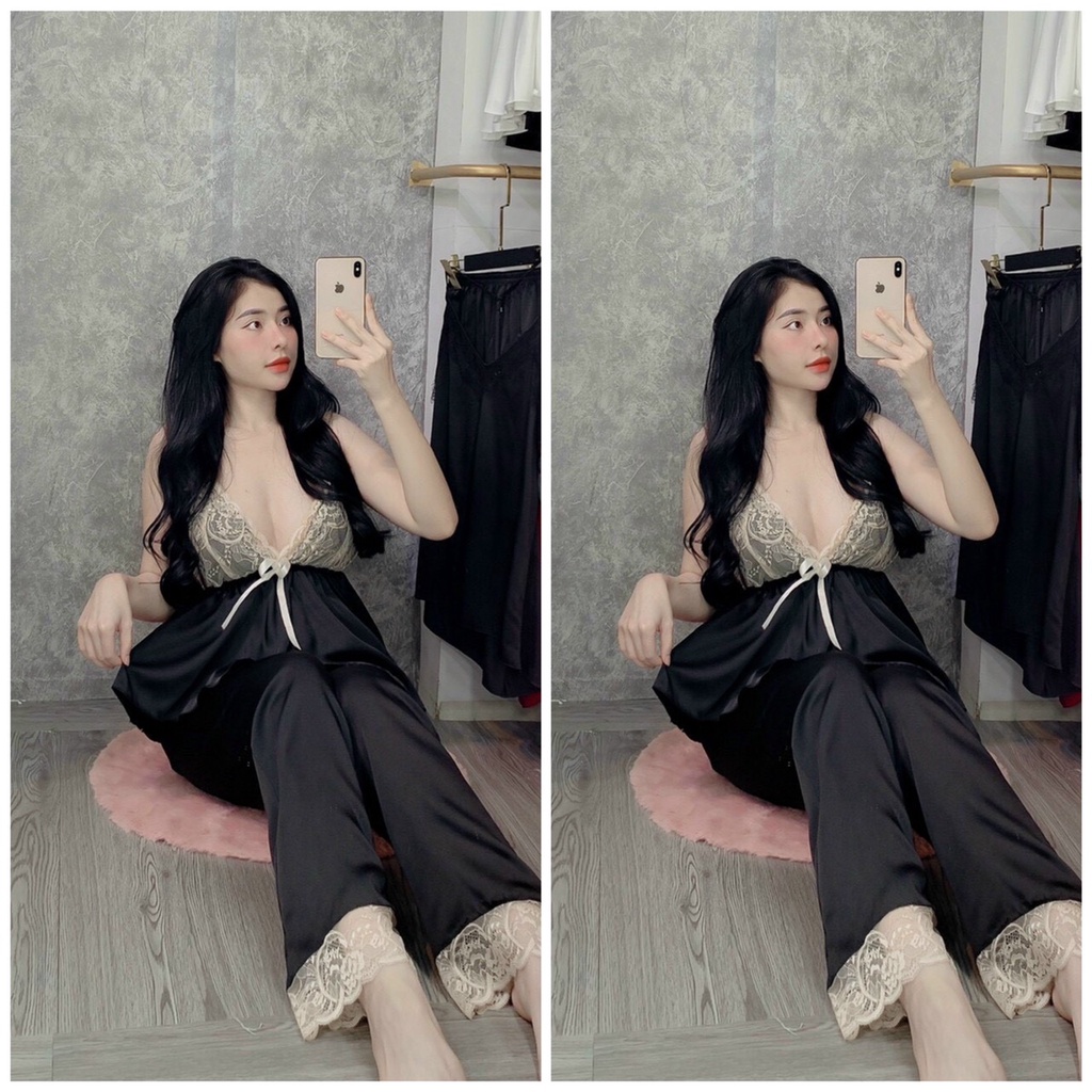 Đồ ngủ sexy, Đồ ngủ 2 dây quần dài phối ren gợi cảm có mút ngực, đồ bộ satin mặc cực mát