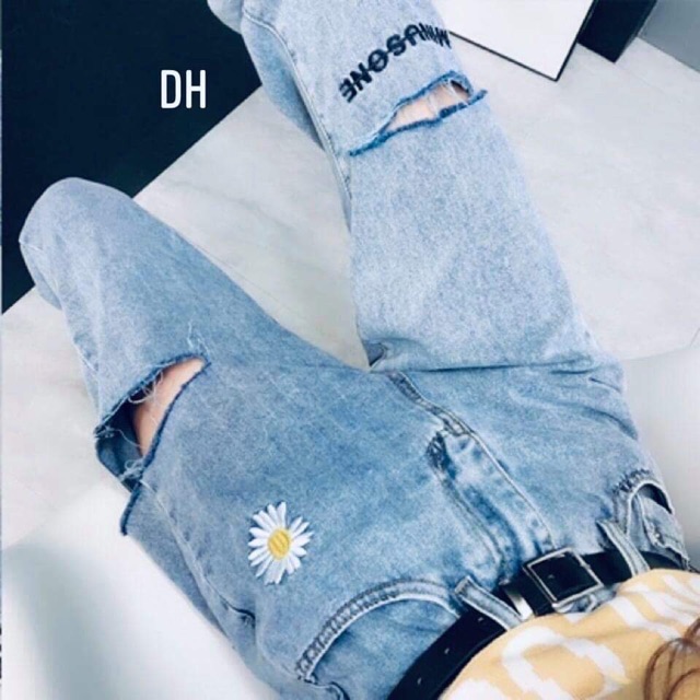 Quần baggy bò thêu hoa cúc rách gối rách hông