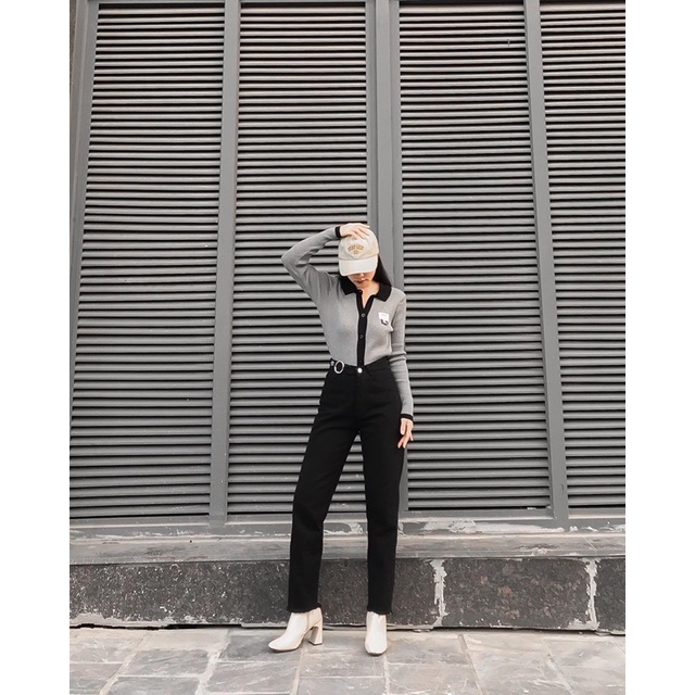 Thời Trang Nữ > Quần jeans || Quần Baggy Jeans Đen Cạp Cao - Áo Len Polo