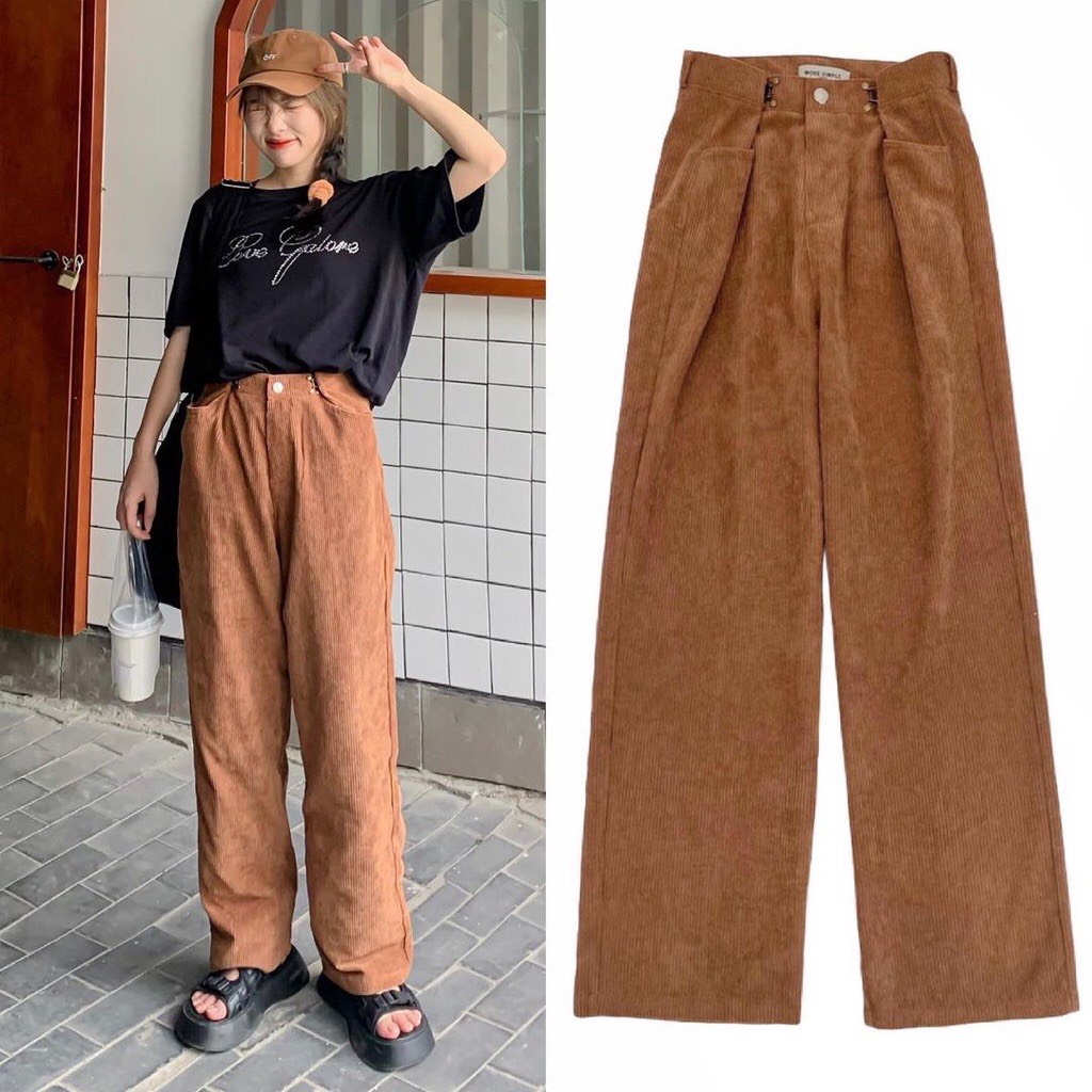 Quần dài nhung gân form suông dáng dài cạp cao phối móc cài Hàn Quốc Sollle