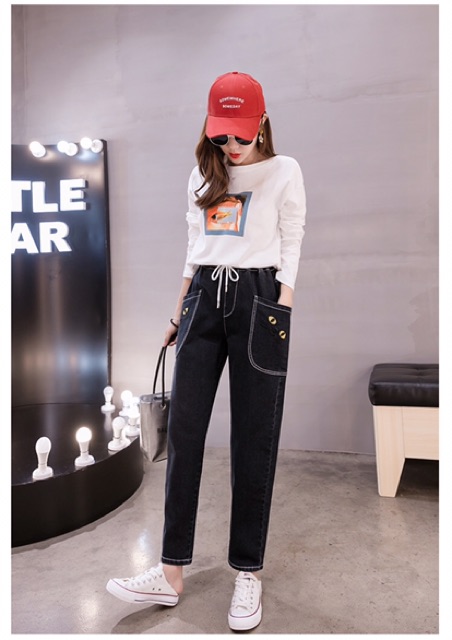 Thời Trang Nữ > Quần jeans || Quần jean baggy dài big size lưng thun màu đen, xanh túi to mắt mèo size 70-90kg