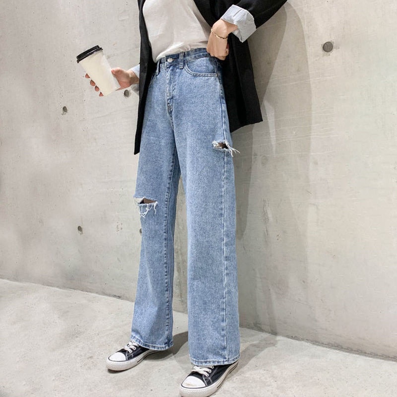Giới thiệu Quần jean ống rộng rách hai bên cạp cao hai màu xanh đậm , xanh nhạt , Quần bò ống đứng hách dáng YANSOO