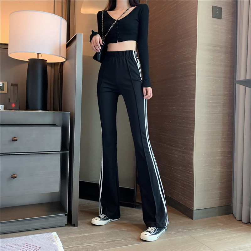 Quần ống loe nữ cạp cao dáng dài 3 sọc thể thao cá tính kiểu dáng mới nhất 2021