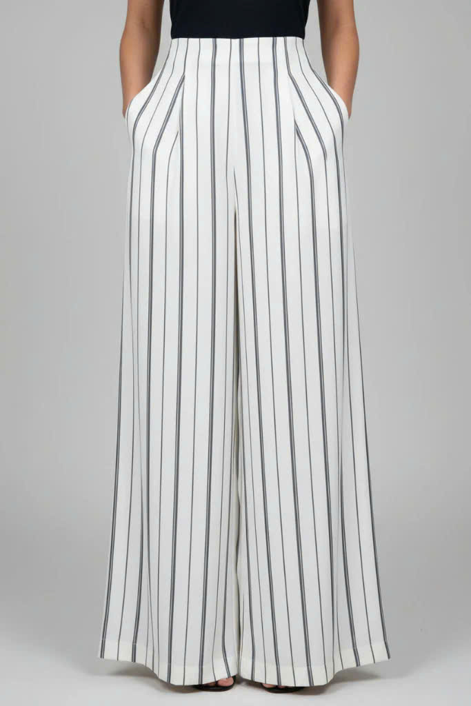 Bạch là chiếc quần palazzo ống rộng sọc trắng đen — cạp cao ngang eo, xếp ly phía trước tạo độ phồng nhẹ ở hông, ống buông suông xuống tận mắc cá chân. Mỗi bước đi, vải chuyển động theo — nhẹ, rộng, và tự do.