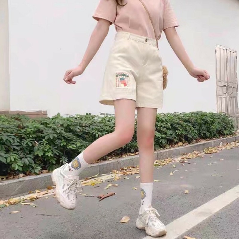 Giới thiệu Quần đùi Nữ ống rộng lưng cao hàn quốc kaki đắp hoạ tiết ấn tượng M Fashion SN02
