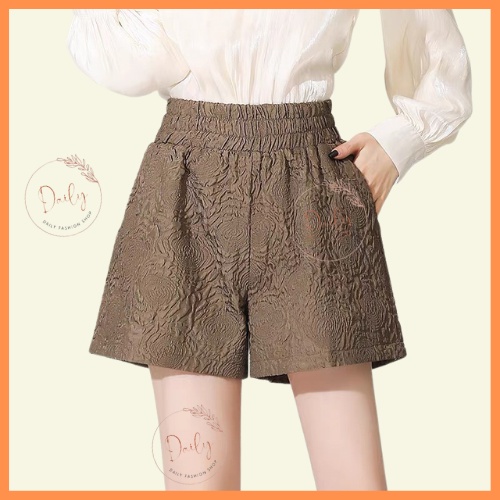 Quần Short Nữ Ống Rộng Phồng Nhẹ Dập Nổi In Hoa 3D Cạp Chun Cao Sang Chảnh Daily