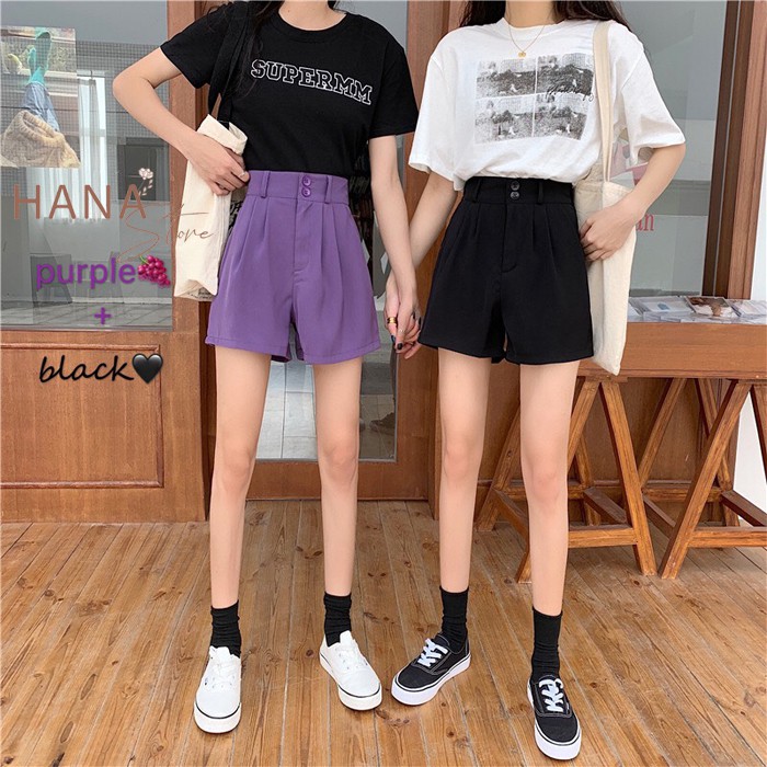 Giới thiệu Quần sooc sọt nữ ống rộng cạp lưng siêu cao phối 2 khuy cài - Màu Đen Tím - Vải mềm - Form rộng mặc lửng ngắn ngang gối