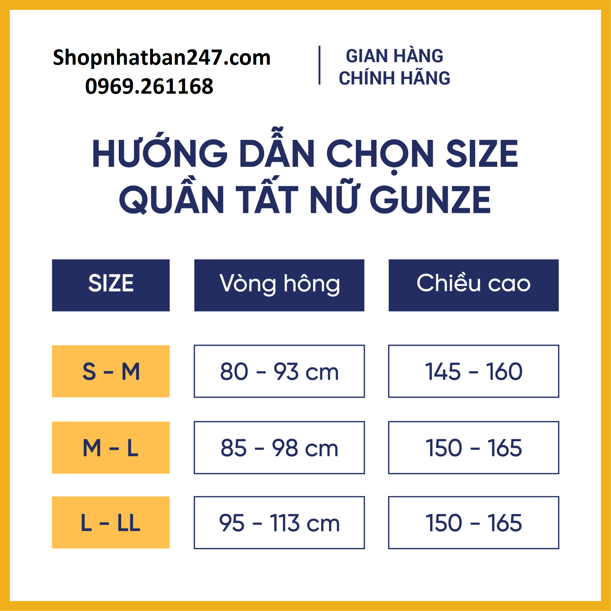 Kích thước | KÍCH THƯỚC QUẦN TẤT GUNZEM-L: vòng hông từ 85 -> 98 cm / Chiều cao từ 150 -> 165 cmL-LL: vòng hông từ 90 -> 103 / Chiều cao từ 155 -> 170 cm |
