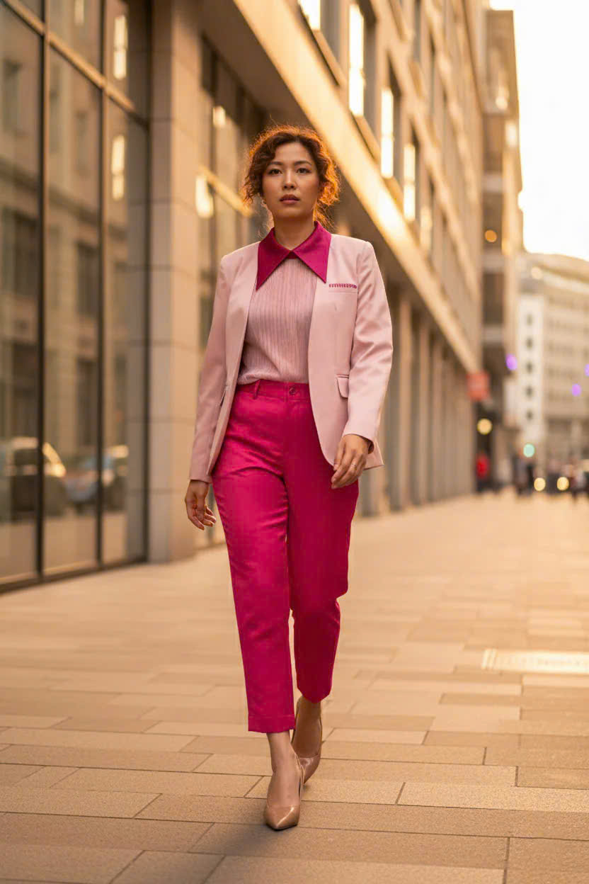 Chiếc quần fuschia khẽ chuyển động theo từng sải chân, vừa đủ mềm để lướt đi nhẹ nhàng, vừa đủ đứng dáng để giữ lại thần thái của người phụ nữ biết mình đang đi đâu. Sắc hồng rực rỡ nhưng không ồn ào, như cách ta chọn niềm vui: rõ ràng, giản dị, mà không cần giải thích.