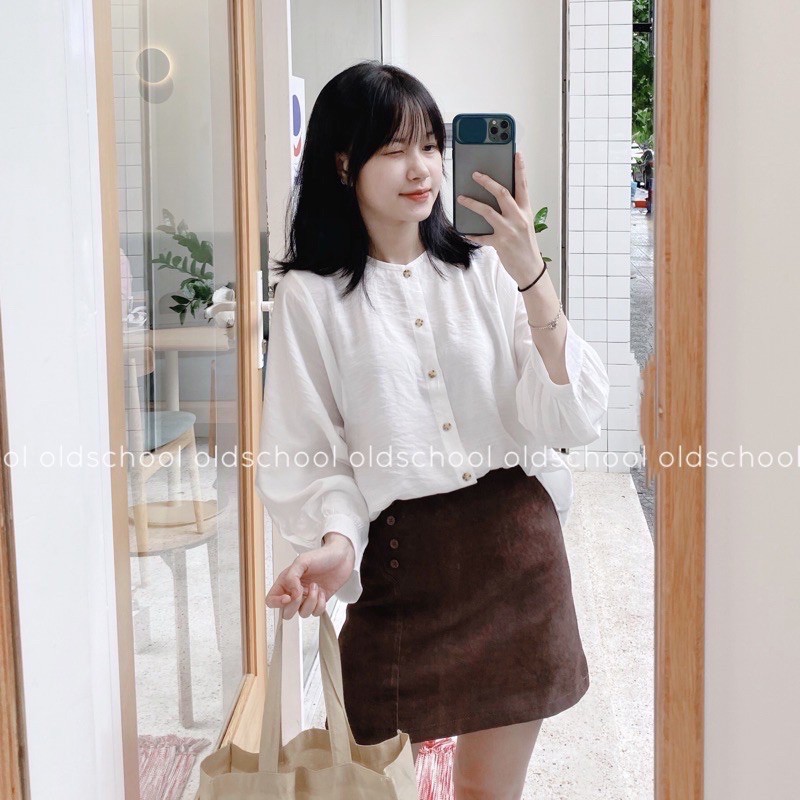 {Có Sẵn}Áo đũi hàn quốc tay phồng cúc bọc kèm feedback khách mặc