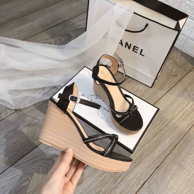 Thiết kế đế vân gỗ sang chảnh, quai nhỏ chéo phối chữ lên chân vừa sang vừa tôn chân khách nhé