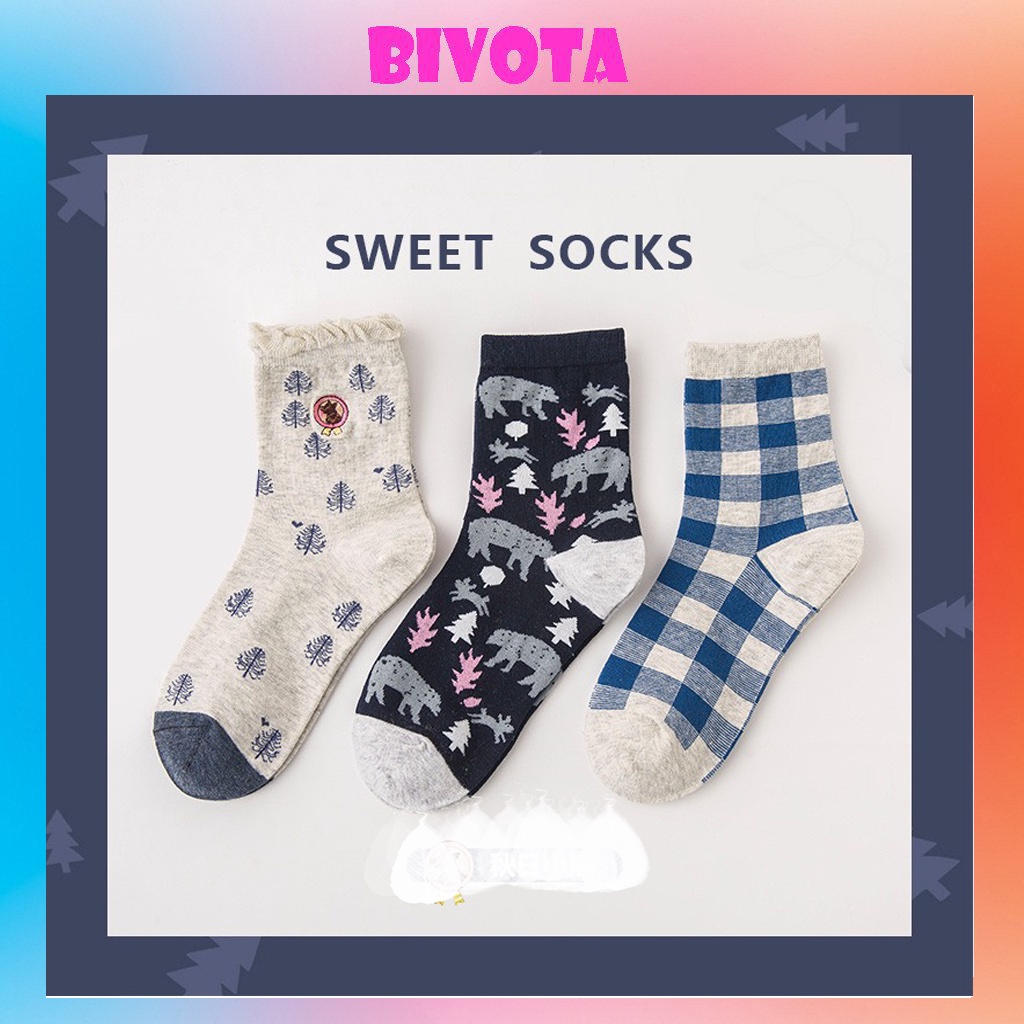 Set 3 đôi tất cổ cao Bivota vớ nữ họa tiết gấu và cây thông xinh xắn T97