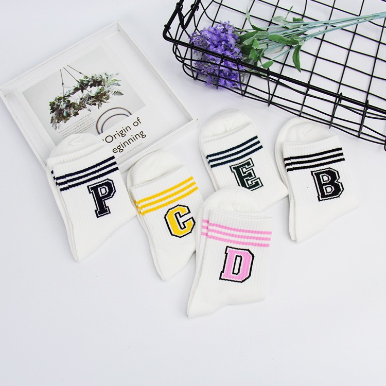 Set 5 đôi tất cổ cao Bivota vớ nam nữ trắng in hình chữ cái thể thao T06