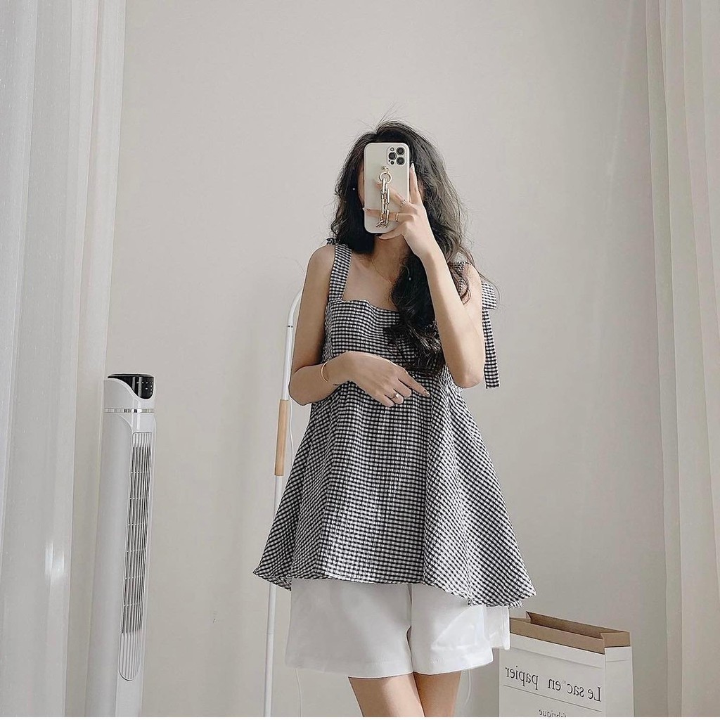 Giới thiệu Set Áo Babydoll Kẻ Buộc Dây + Quần Shorts - Ảnh Thật - Titto Closet