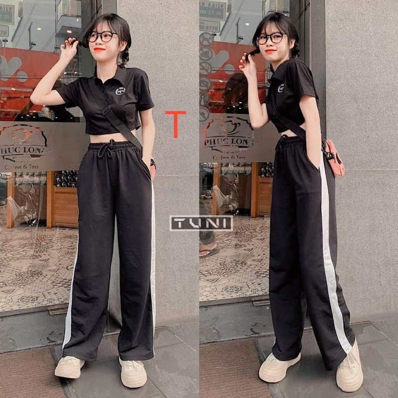 set áo croptop cổ bẻ ngắn tay + quần ống rộng 1 sọc