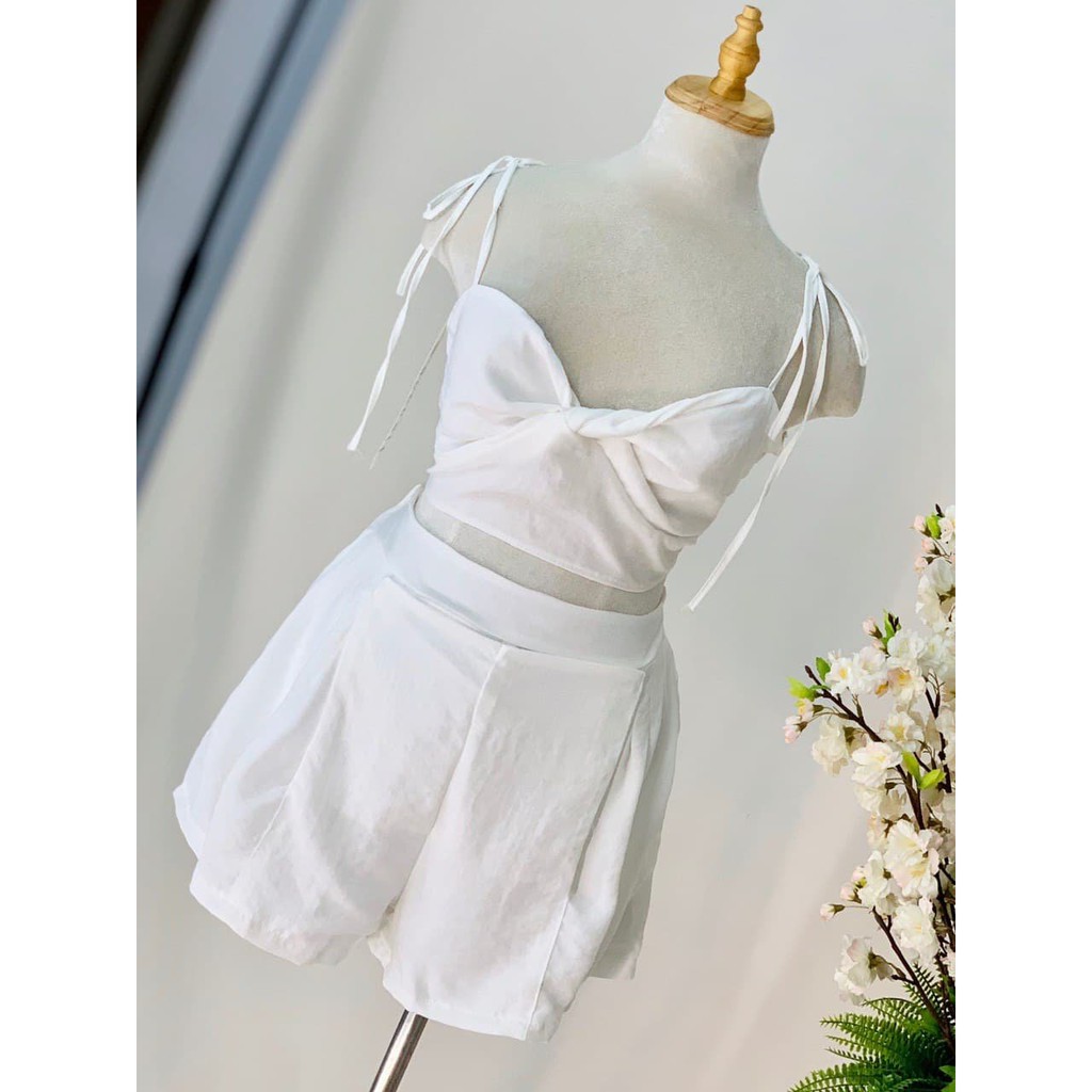 Giới thiệu Set Áo Dây Xoắn Ngực Kèm Quần Rống Rộng Chất Đũi Mềm (TRẮNG+XANH)