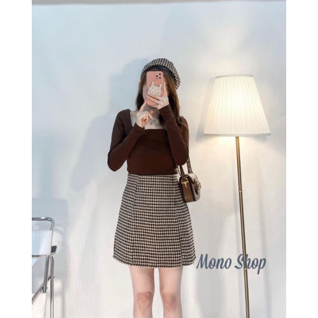 Set áo len tăm kèm chân váy kẻ tặng mũ nồi đen, nâu