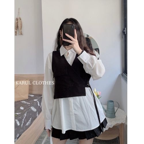 Giới thiệu Set áo sơ mi nữ trắng + yếm vai lệch , Set áo váy form dài cùng yếm đai lệch vạt 2 màu đen, be