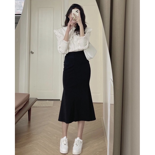 Sét áo somi cổ sen tay bo chun mic chân váy đuôi cá dáng dài chất conton co giãn 4 chiều by YANSOO