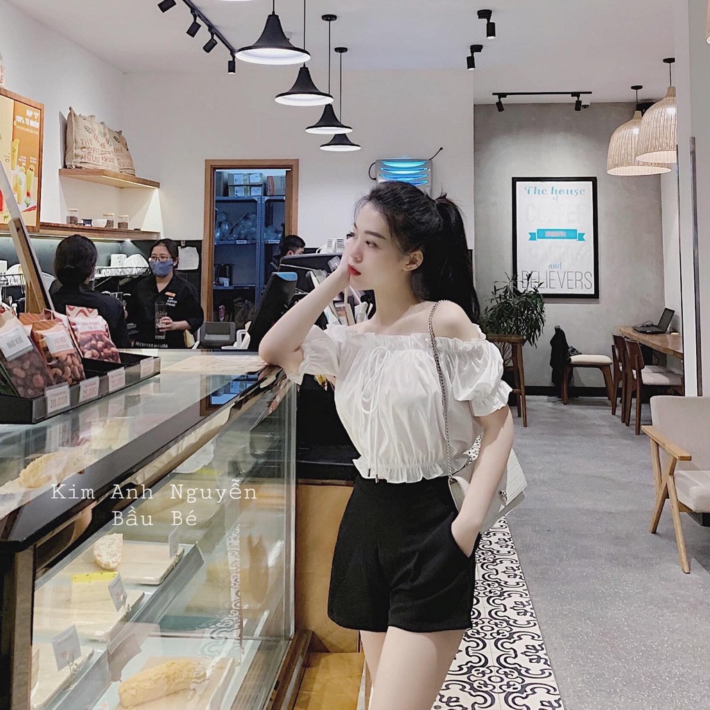 Thời Trang Nữ > Quần đùi > Quần đùi || SET ÁO TRỄ VAI BÈO TRẮNG MIX QUẦN ĐÙI UMI ĐEN HOT