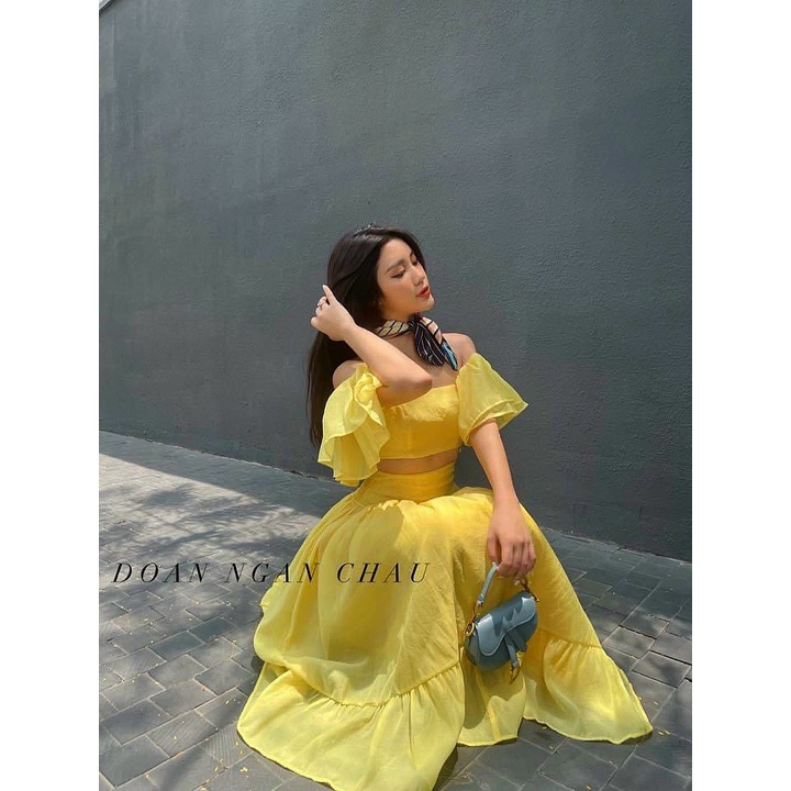 Giới thiệu Set áo trễ vai croptop chun lưng mix chân váy nửa cạp chỉ chun chất tơ 2 lớp áo kèm cúp ngực.Ảnh chụp hàng thật