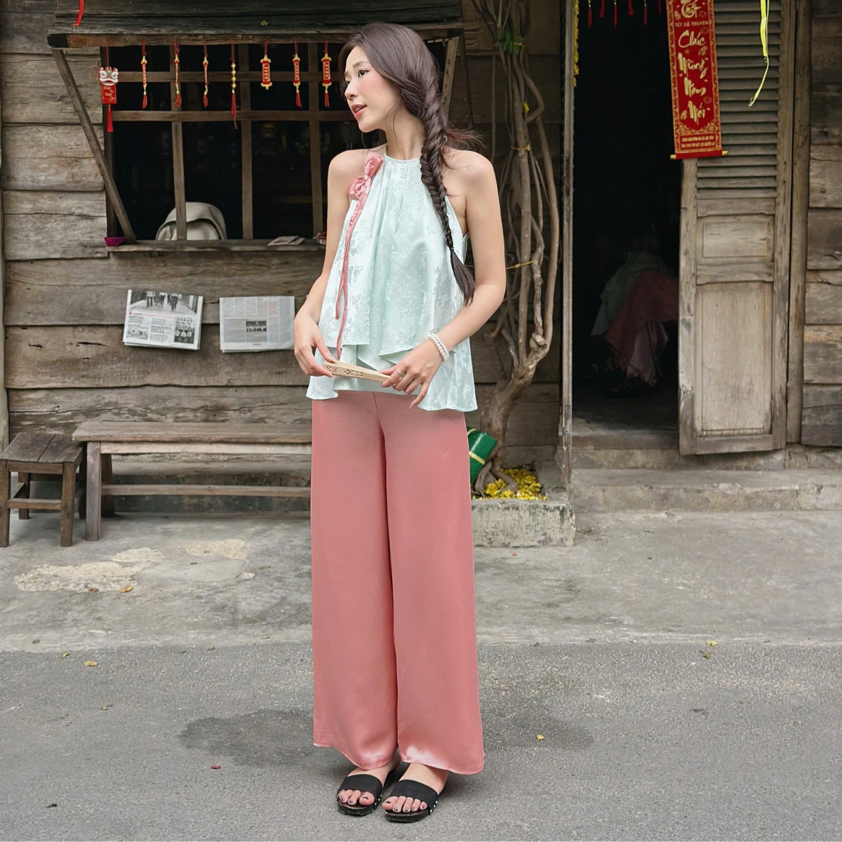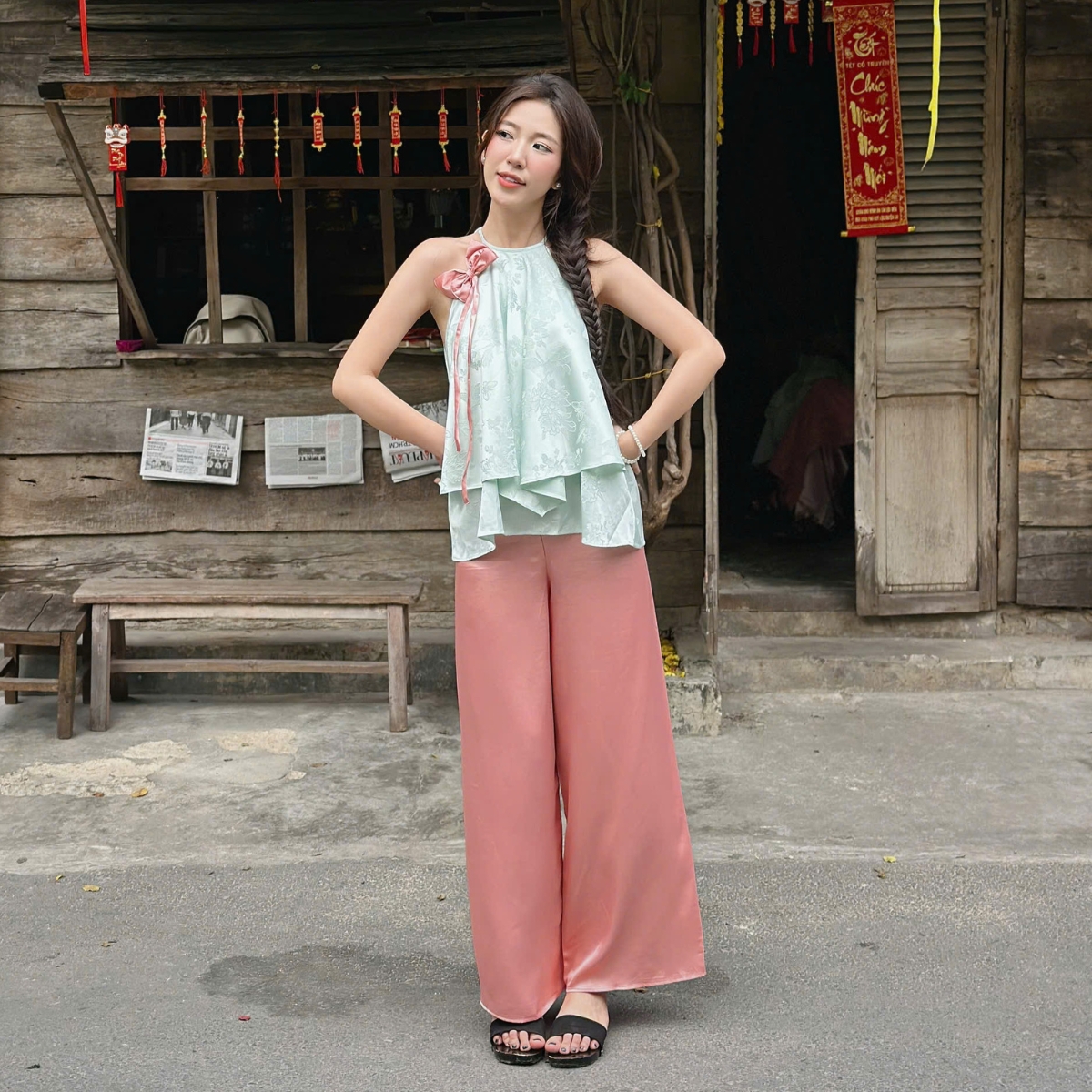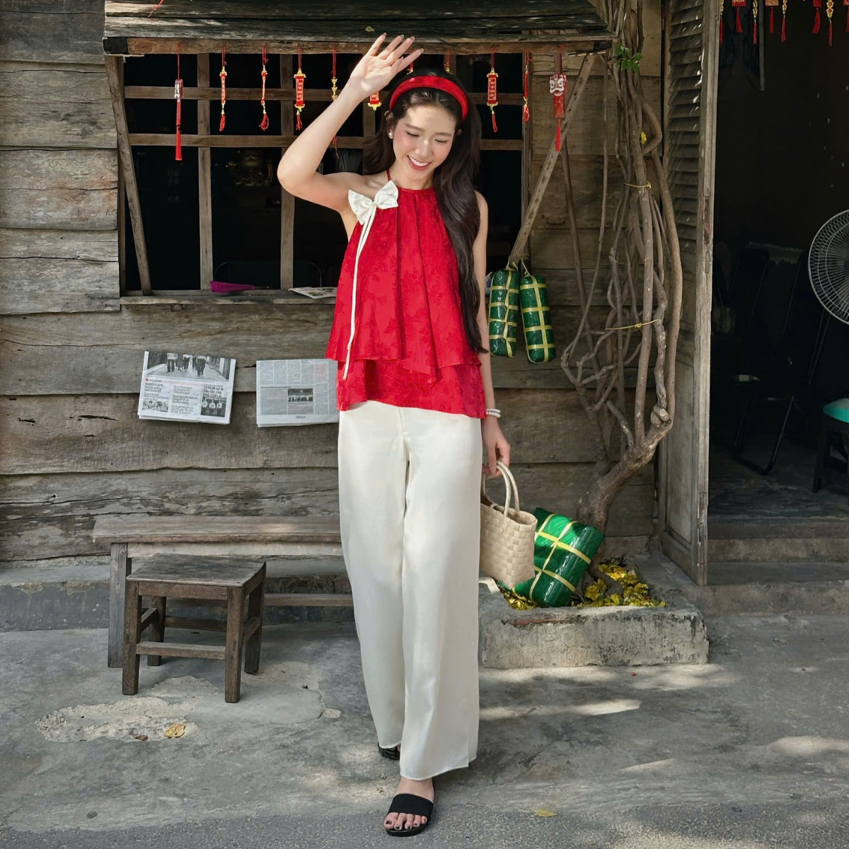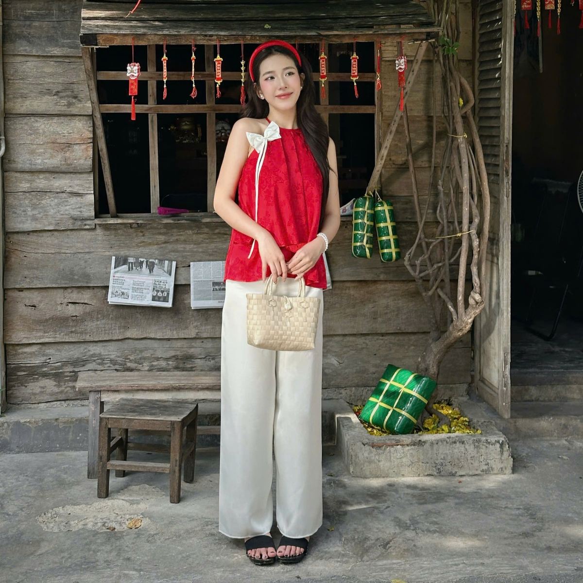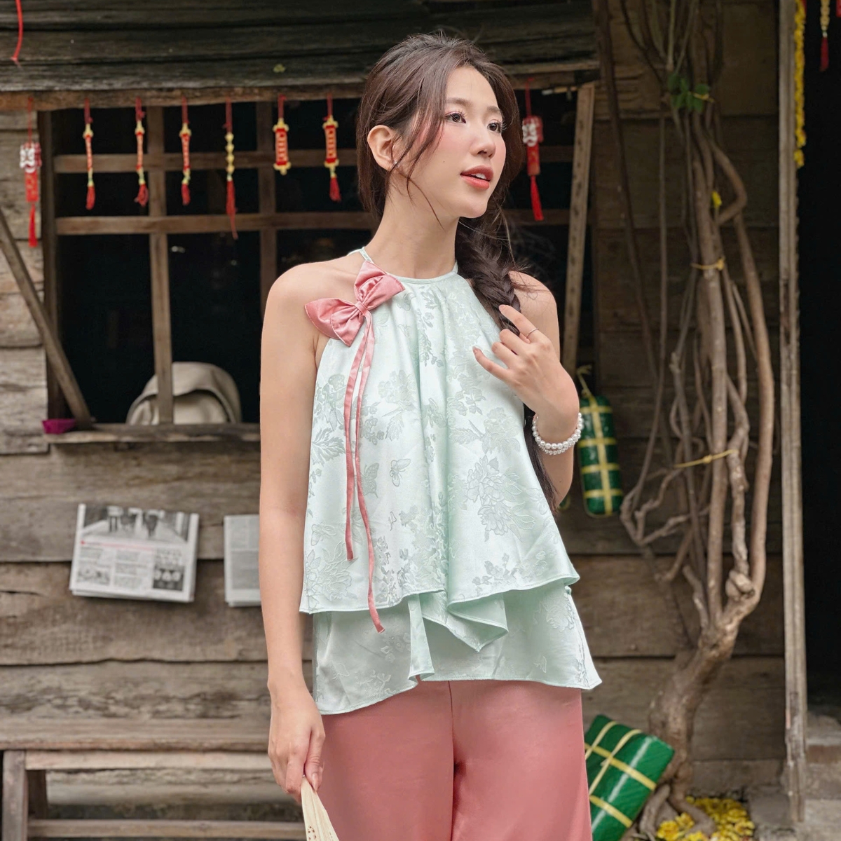 ✿ Sản phẩm : Set áo yếm phối nơ cổ kèm quần thích hợp đi chợ Tết Bảo An Miều Est.2013