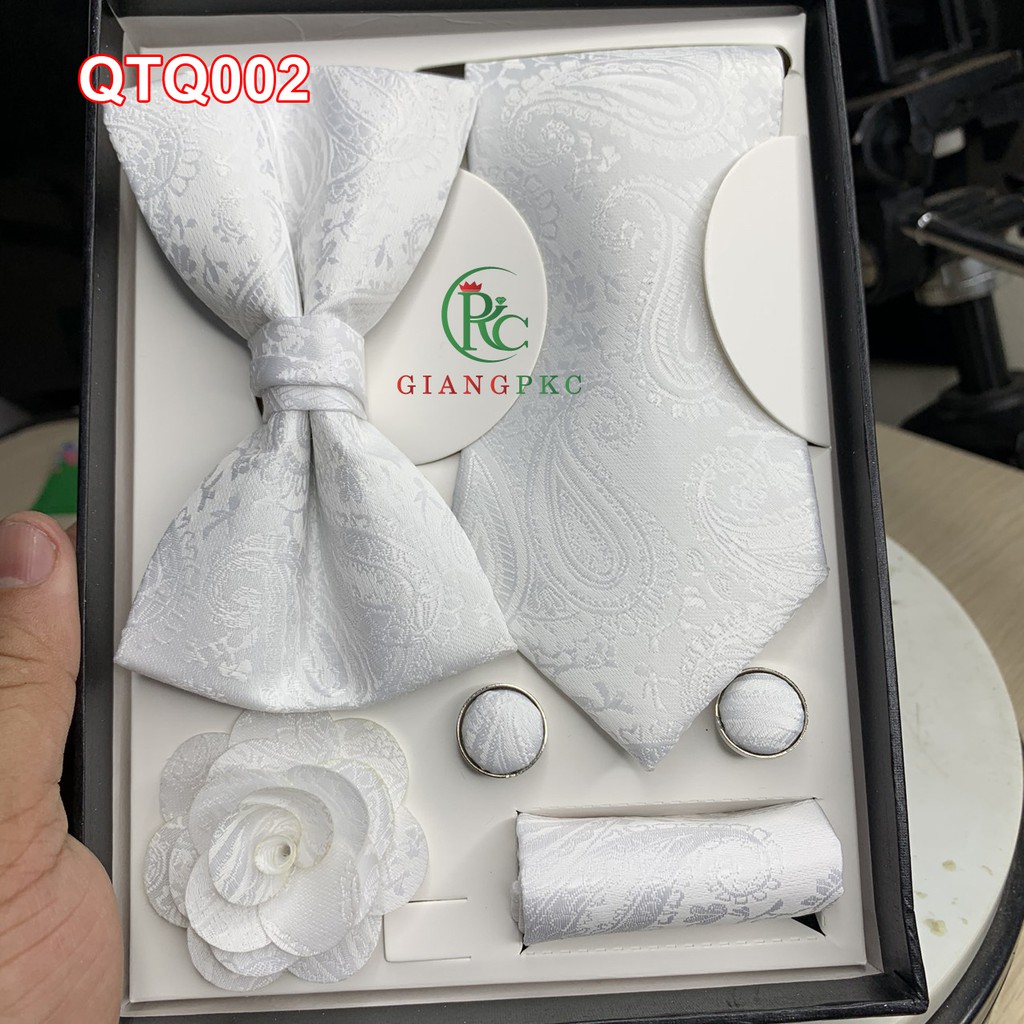 Giới thiệu Set cà vạt họa tiết + măng séc + khăn cài áo sang trọng + nơ họa tiết gấm trắng Giangpkc qtp001