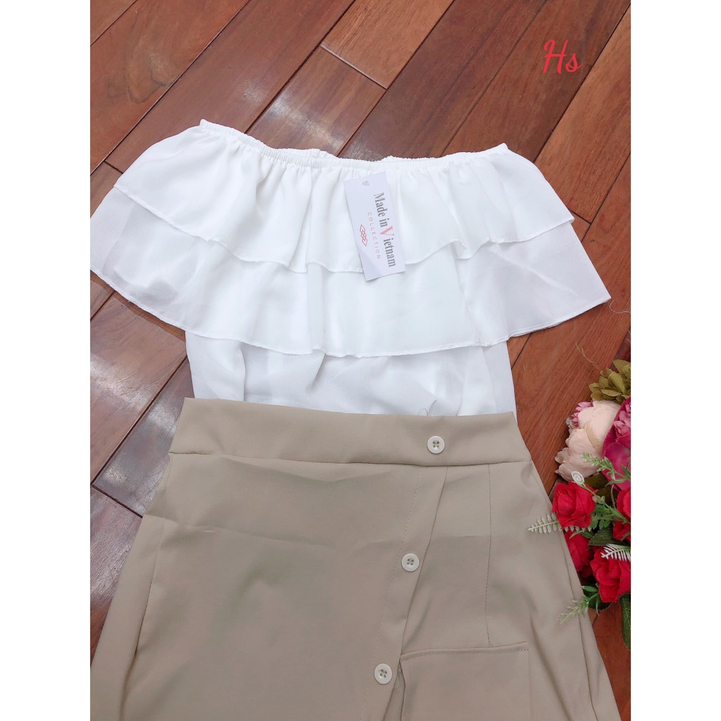 Set Chân Váy 3 Cúc , Áo Trễ Vai Trắng Tay Phồng Mã 444