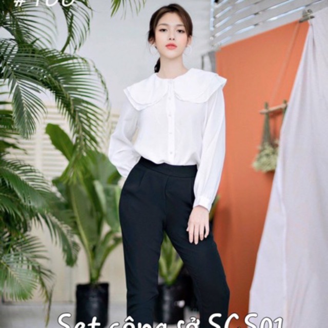 Áo sơ mi basic phối quần suông siêu gọn dáng