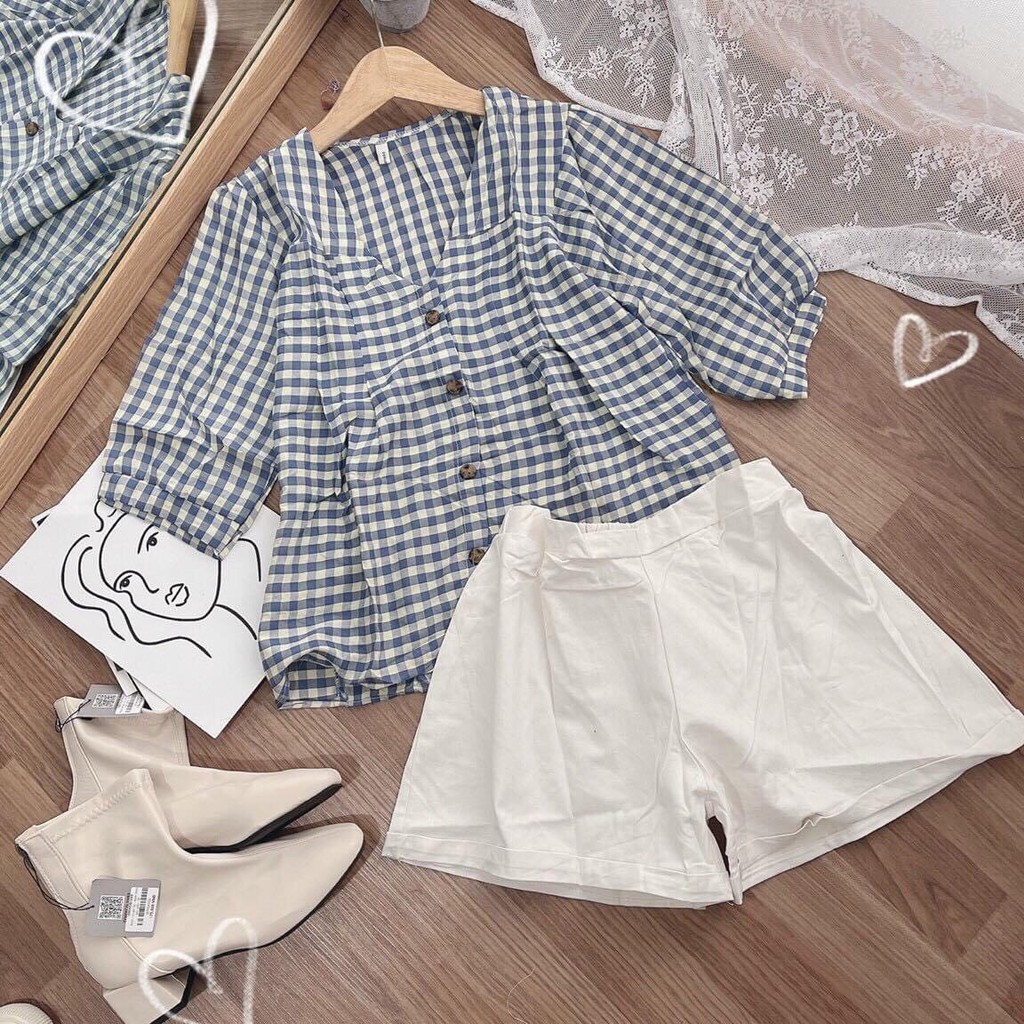 SET ĐỒ NỮ ÁO SƠ MI KẺ CARO PHỐI QUẦN ĐÙI NGẮN ĐŨI BABYDOLL❤️SET ĐỒ NỮ❤️ ÁO SƠ MI KẺ CARO TAY LỠ KÈM QUẦN SHORTS NGẮN