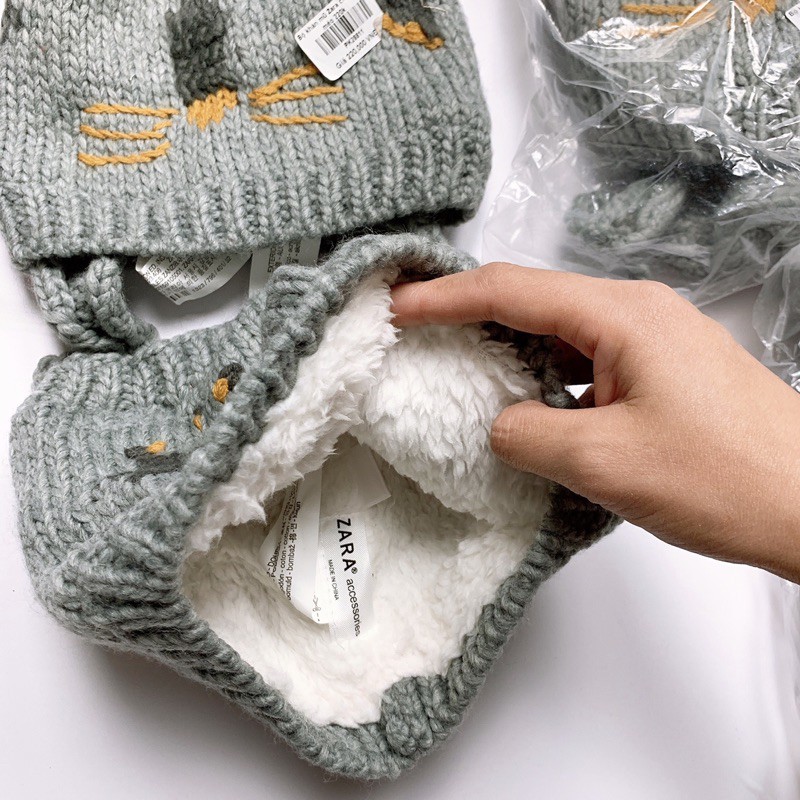 Set khăn mũ len Zara hoạ tiết chuột và mèo siêu cute, mũ lót nỉ, khăn lót lông