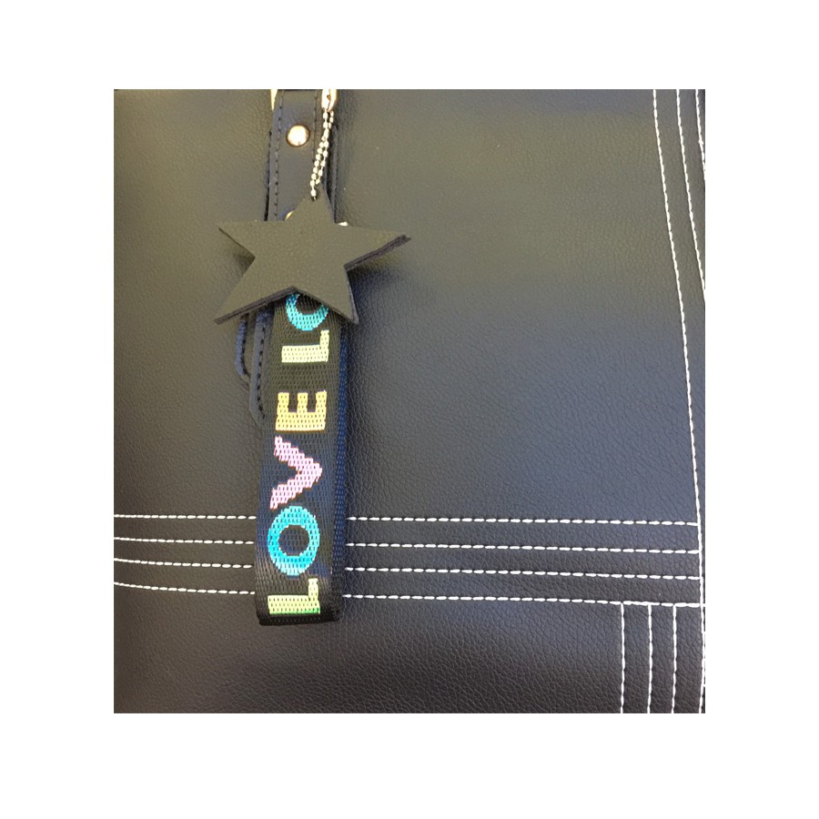 * Phía trước túi lớn được thiết kế kiểu dáng đơn giản nhưng sang trọng với đường trần chỉ nổi bật và kèm 1 dây vải in chữ Love cũng ngôi sao nhỏ vô cùng tinh tế, dây có móc cài để bạn có thể dễ dàng gắn vào hoặc tháo ra tùy theo ý bạn.