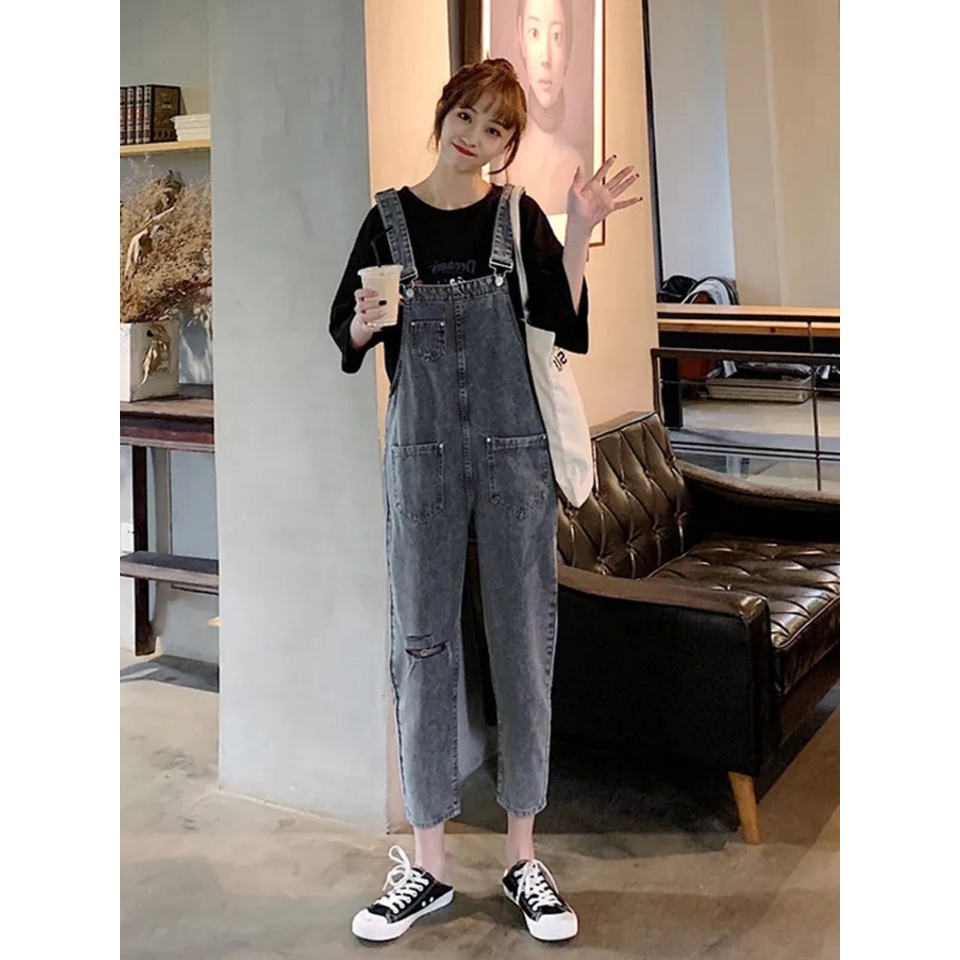 Giới thiệu Set Yếm Jeans Vintage Phối Túi Trước mix Áo Thun Tay Lỡ Vải Lụa Mềm Ulzzang