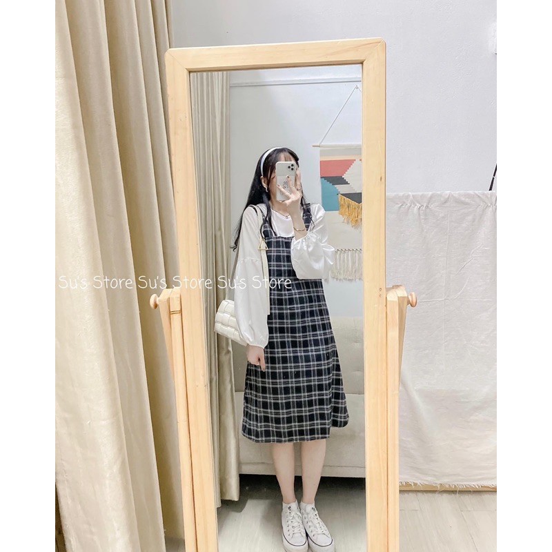Thời Trang Nữ > Đồ liền thân > Quần yếm || set yếm kẻ 2 món kèm áo hình mẫu chụp thật