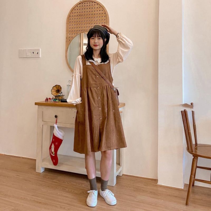 Thời Trang Nữ > Đồ liền thân > Quần yếm || Set yếm nâu kèm áo sơ mi nude cổ sen dễ thương kèm ảnh thật