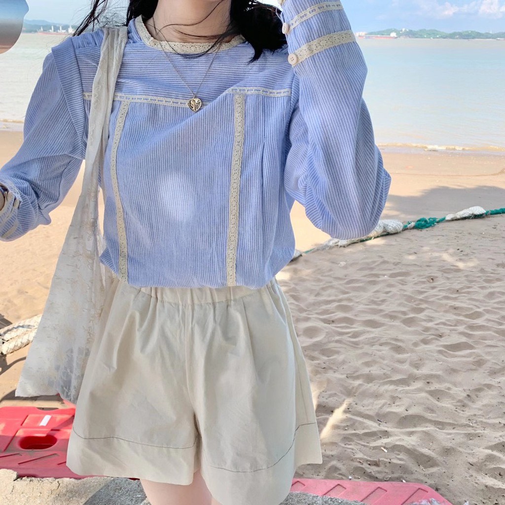 Thời Trang Nữ > Áo > Áo sơ mi || Sơ mi cổ tròn sọc viền ren Misumey mặc 2 kiểu Ulzzang styleHàng Quảng Châu