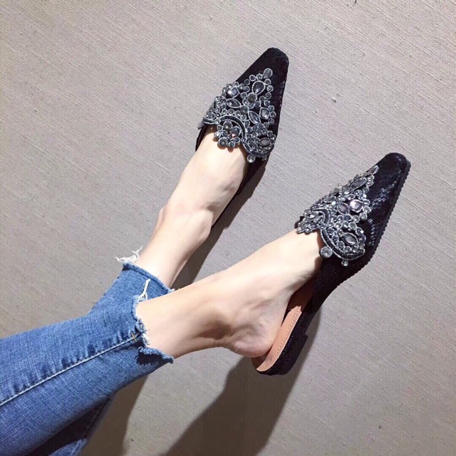 Giày Dép Nữ > Giày đế bằng > Giày sục & Giày búp bê || Sục ren nữ gắn tag đá sang chảnh (chat trước check size)