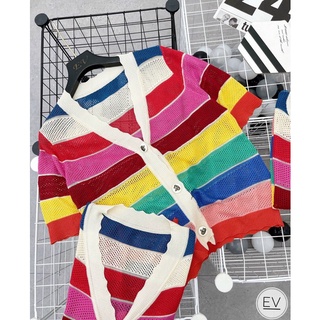 Áo len nữ montoghi tiêu kẻ croptop cổ tròn viền khuy pha siêu hot