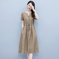 Đầm sơ mi nữ form suông ngắn tay, Đầm đũi nữ cổ sơ mi kèm dây thắt eo màu rêu Da75