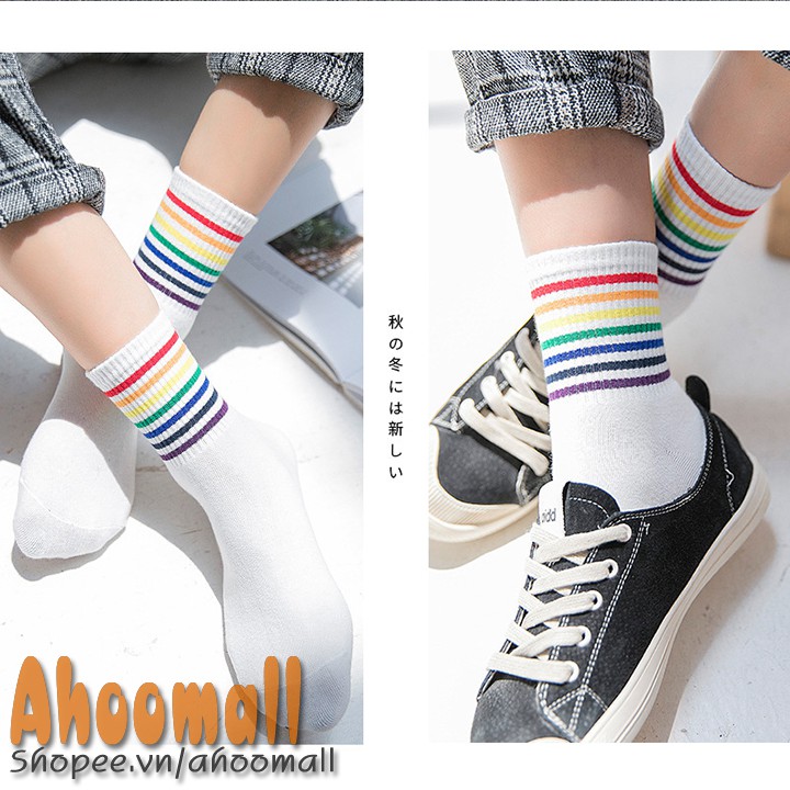 Tất nam nữ cổ cao sọc cầu vồng xuất Hàn quốc - Vớ nam nữ unisex đẹp style Korea giá rẻ