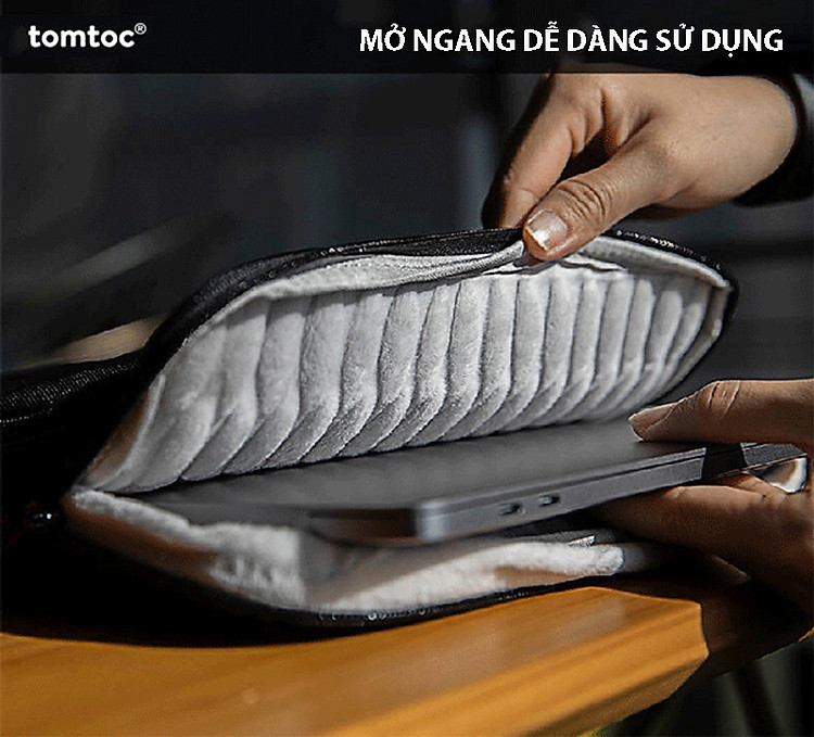 Túi chống sốc chính hãng TOMTOC 360° Protection Premium với bên ngoài bằng chất liệu Vải cao cấp Cordura thời trang, chống bụi bẩn và kháng nước , đặc biệt trang bị thêm lớp mood gợn sóng chéo bên trong đẹp mắt và giúp gia tăng sự đàn hồi, bảo vệ hoàn hảo chống va đập và trầy xước cho máy tính.