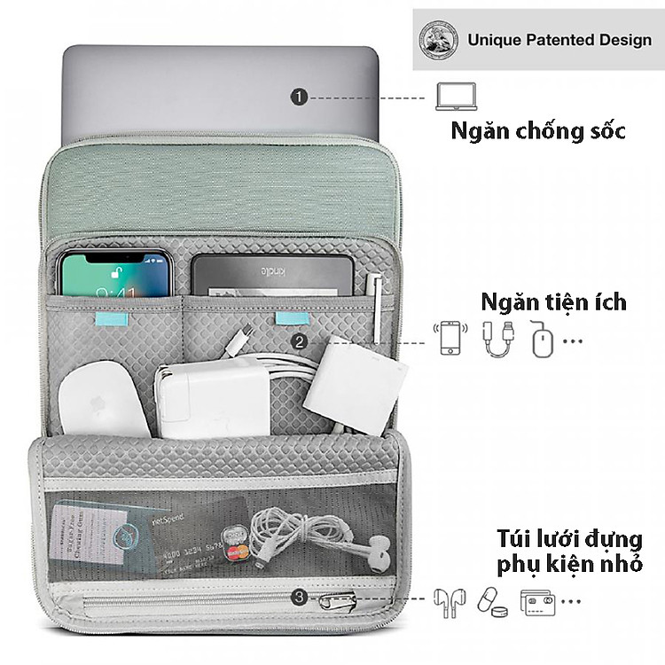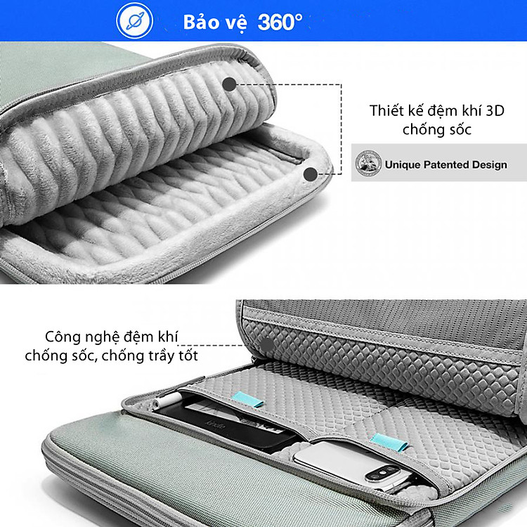 Túi 360° Protection Premium có kích thước 31.24 x 23.21 x 2.21 (cm) nhẹ 7.9 (g) có cấu trúc ngăn đựng gồm: