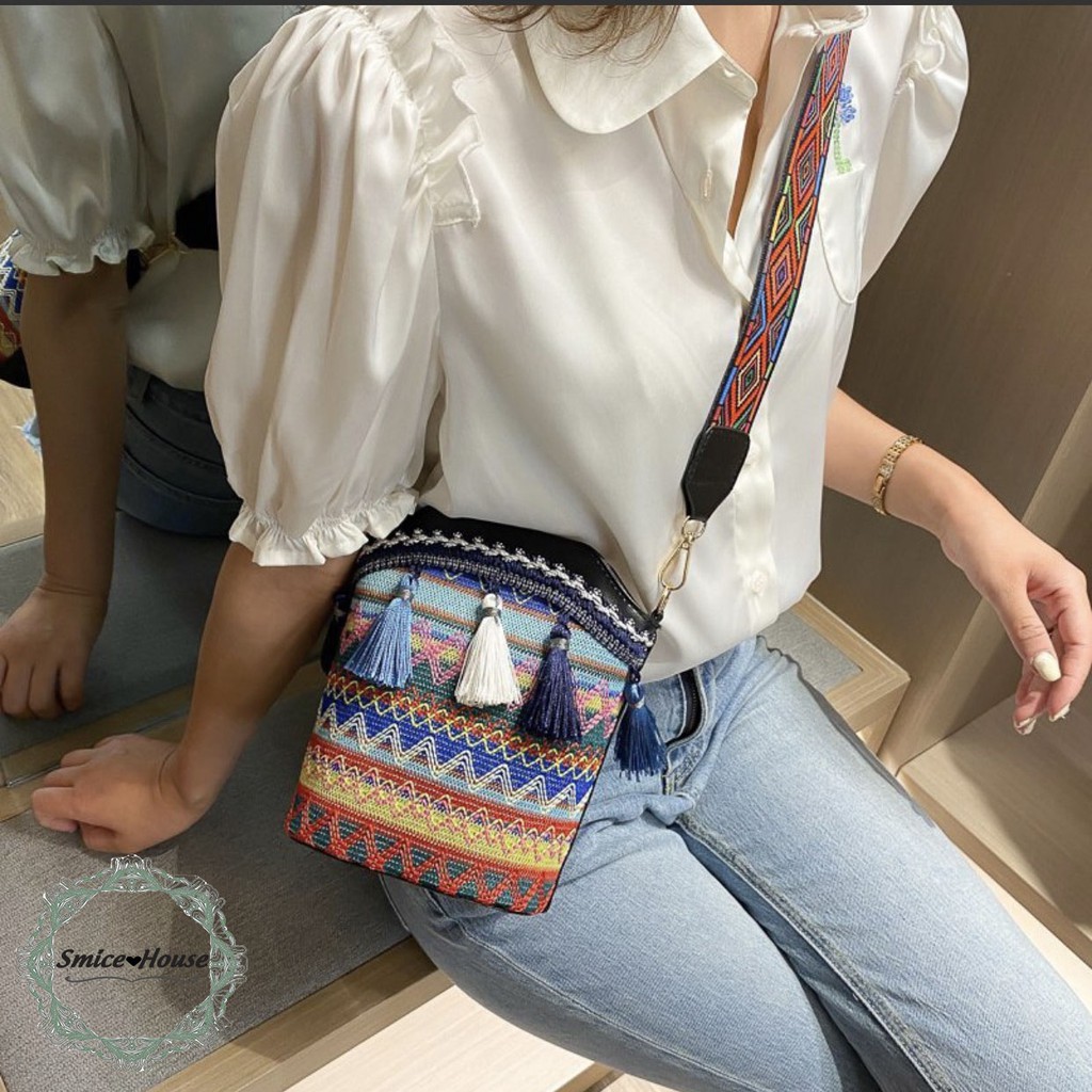 Túi cói đeo chéo nữ họa tiết thổ cẩm tua rua phối da đi dạo đi biển mùa hè retro hoang dã