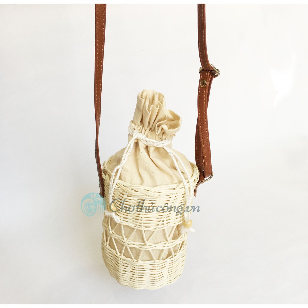 Túi Xách Đan Mây tự nhiên dạng tròn KT C18xR13cm lót vải canvas dày màu kem phối quai simili loại tốt chắc chắn