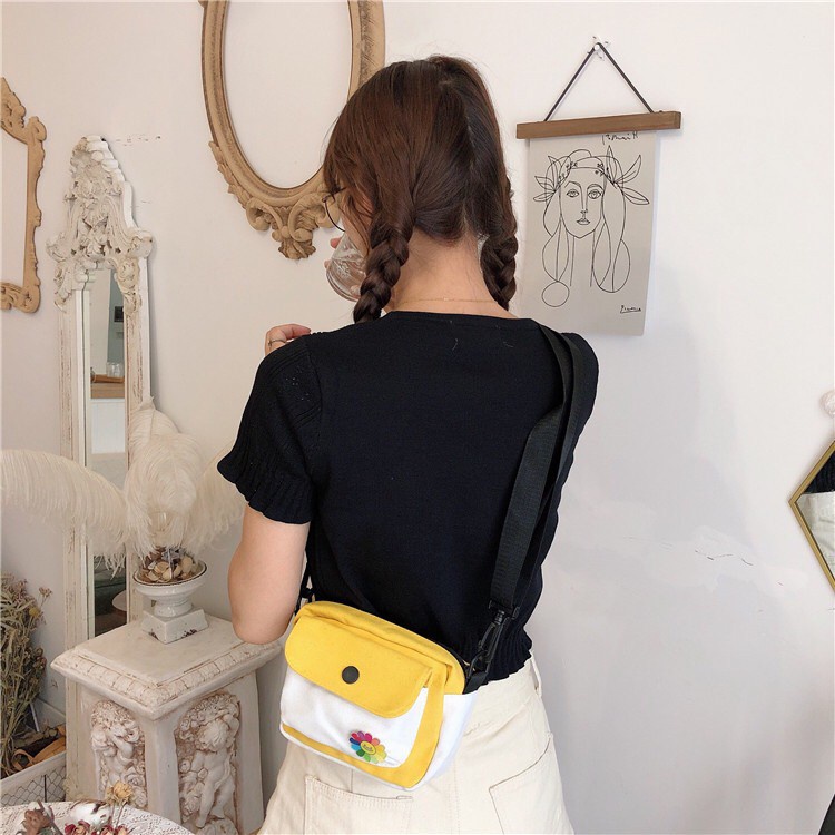 Túi đeo chéo vải đa năng phối màu dễ thương kèm hoa cài 7 màu