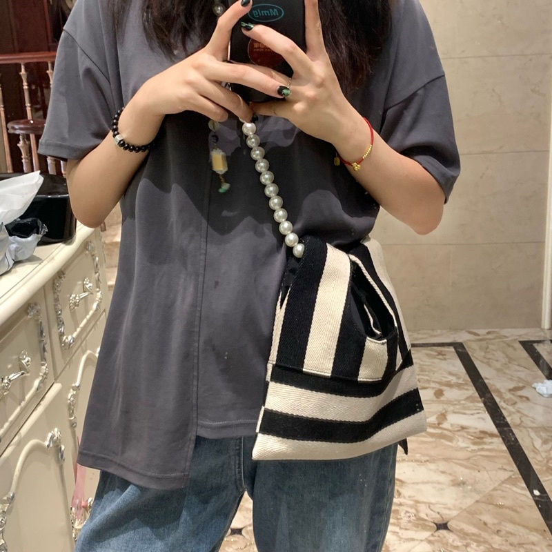 Túi Đeo Chéo Vải Kẻ Sọc Đen Kem Dây Chuỗi Ngọc
