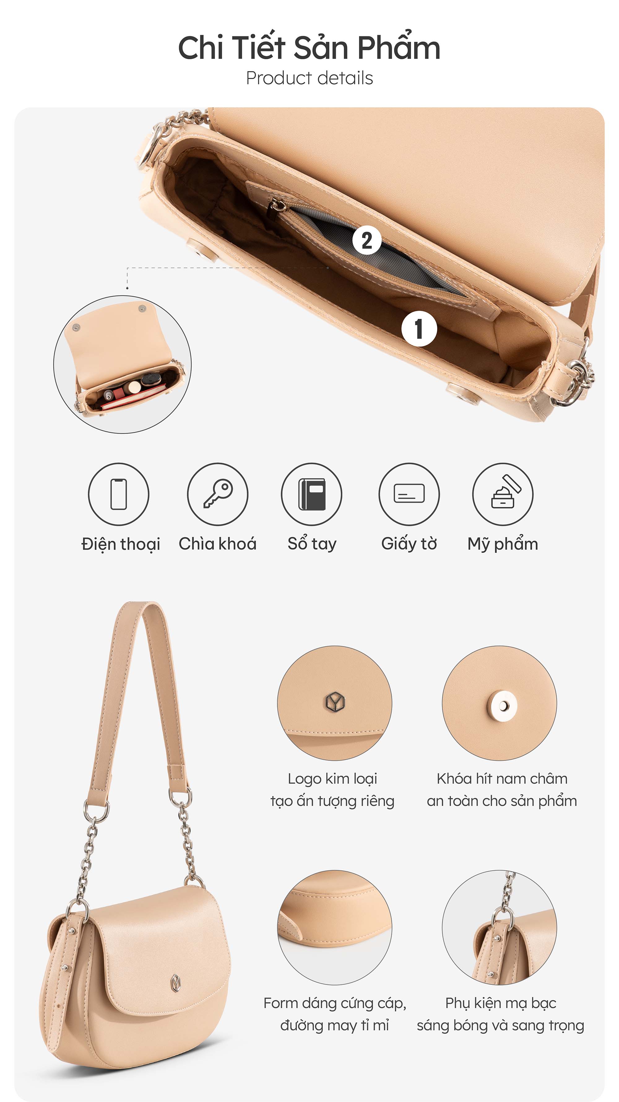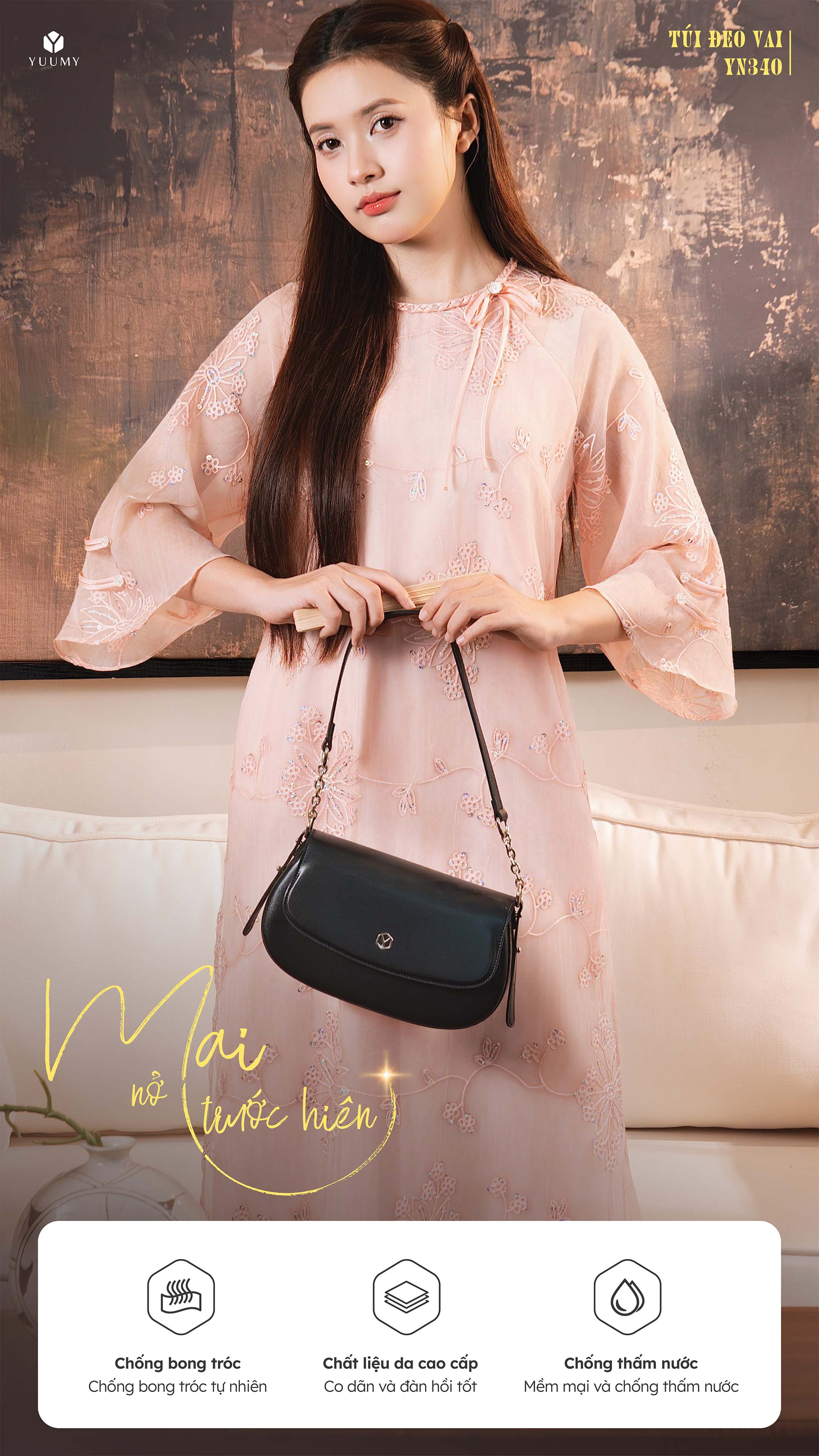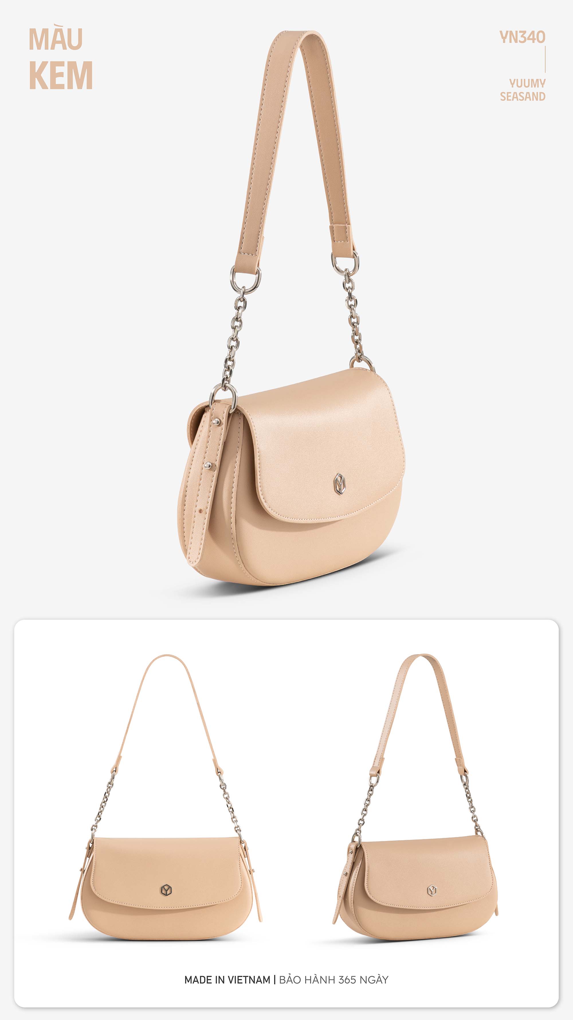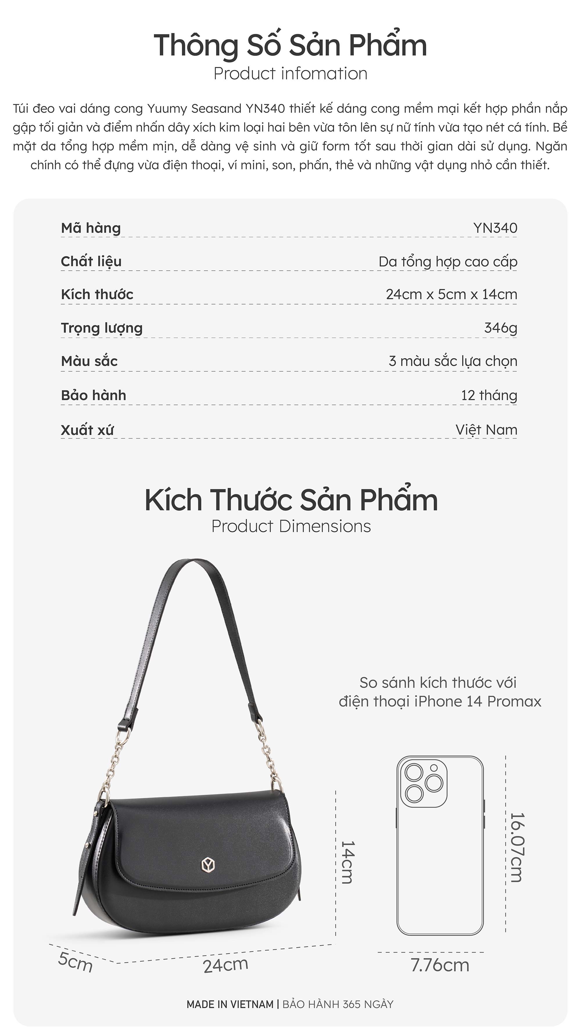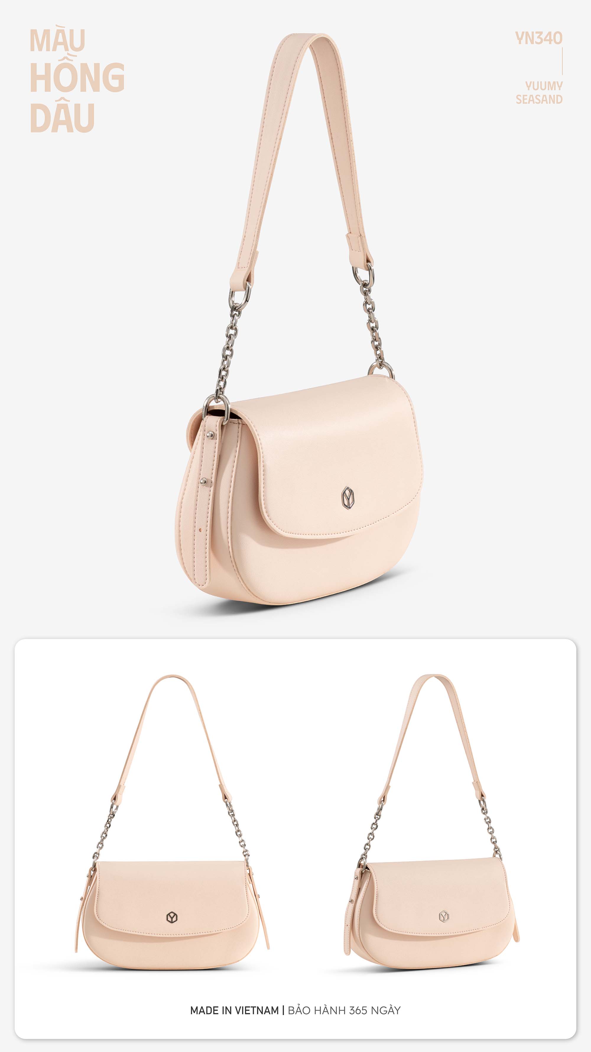 Túi đeo vai dáng cong Yuumy Seasand YN340 thiết kế dáng cong mềm mại kết hợp phần nắp gập tối giản và điểm nhấn dây xích kim loại hai bên vừa tôn lên sự nữ tính vừa tạo nét cá tính. Bề mặt da tổng hợp mềm mịn, dễ dàng vệ sinh và giữ form tốt sau thời gian dài sử dụng. Ngăn chính có thể đựng vừa điện thoại, ví mini, son, phấn, thẻ và những vật dụng nhỏ cần thiết mỗi ngày. Chiếc túi nhỏ xinh nhưng đủ sức làm điểm nhấn cho cả set đồ – bởi vì “đúng gu” luôn là yếu tố tạo nên sự cuốn hút.