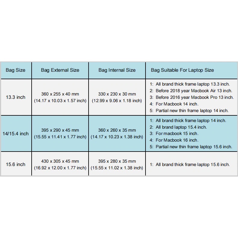 * LƯU Ý: KHÔNG NÊN CHỌN SIZE THEO THÔNG SỐ "INCH" CỦA MÁY, VUI LÒNG ĐO KÍCH THƯỚC DÀI X RỘNG CỦA MÁY VÀ THAM KHẢO KÍCH THƯỚC TÚI CÓ TRONG ẢNH ĐỂ THAM KHẢO SIZE TÚI PHÙ HỢP.