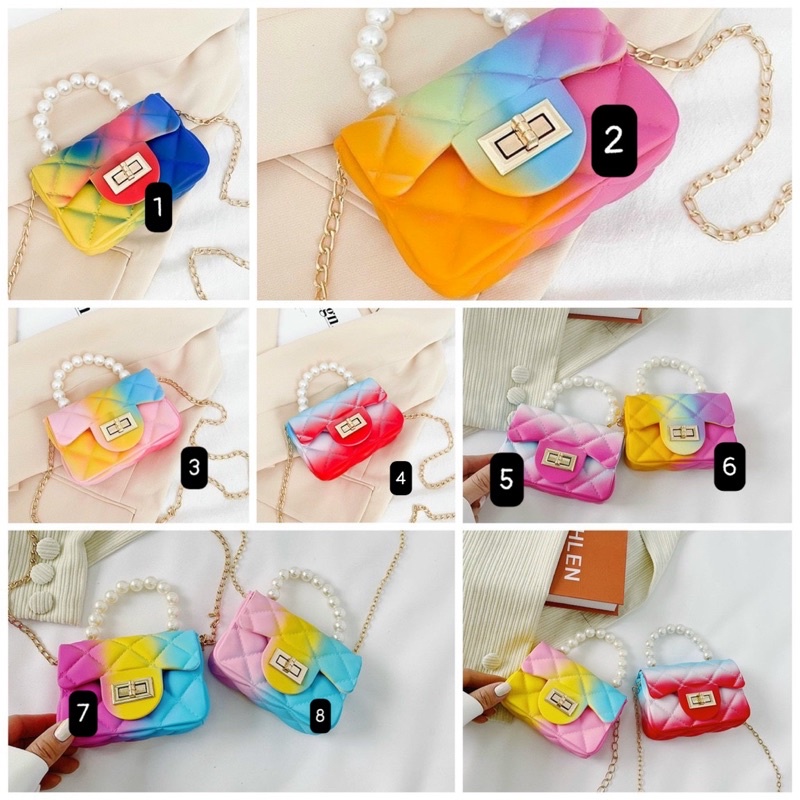 Giới thiệu Túi mini đeo chéo silicon càu vồng có quai ngọc và dây xích đeo chéo